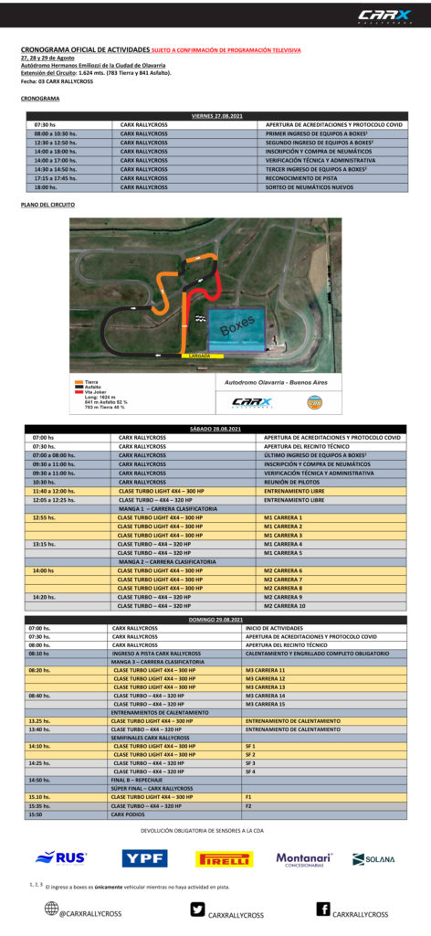 El 27, 28 y 29 de Agosto el CARX RallyCross se presentará por primera vez en el Autódromo de Olavarría y se confirmaron los horarios de la 3° fecha que tendrá en acción a los autos de sus dos clases la Turbo y Turbo Light.